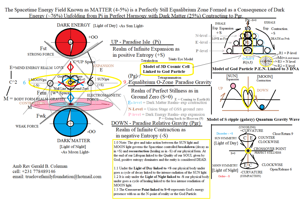 Later Einstein and others stood upon Maxwell’s discovery to realize that Light created something called Spacetime as the source of MASS. Yes, this is a conclusion of Scientific Godism’s research. Space and Time are created reality linked to Gravity/Levity as Light Energy. Thus, what we call GRAVITY from the Quantum Realm is the Spacetime consequence of Mundane Light as a literal VOID SPACE BUBBLE interacting with DARKNESS to create the Higgs Energy Field linked to Dark Matter with negative entropy, and Dark Energy with positive entropy. It is this dual Consciousness Higgs Field that unfolds the WORD of GOD by exponential tunneling from the Quantum Realm (linked to GTR) into a Flat Spacetime Realm (linked to STR). See fig 4 for a pictorial of this process. Via the interplay between Dark Energy and Dark Matter real Matter is born and then dissolved back to its original form as pure LIGHT ENERGY. This cycle of coming into being and going out of being is symbolized as the OUROBOROS, mentioned above as the oneness of infinity. Einstein’s GTR explains the unfolding of the process of the WORD of God as the Garden of Eden coming into being. His STR deals with the flat Earth Spacetime state of reality linked to ITBS as REAL MASS BODIES floating in a Cosmic Sea of Spacetime under the protective umbrella of a 4PFS forces field. Within this unique dual realm Environment of Primal Consciousness Energy like a Cosmic SEA (dark energy) and Cosmic EARTH (dark matter), we find the emergence of a third element as AIR, the Atmosphere filled with U-Ozone protective Gauged Energy called GRAVITY/LEVITY.