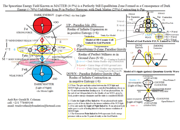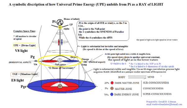 Here we provide a pictorial of how God’s Universal Prime Energy (UPE) Unfolded from Paradise Isle (Pi) the home of the Infinite Spirit as Dual Characteristics. First the “UPE of action” unfolds UPWARD with the limit of Paradise Gravity (Pg) representing the Spiritual Universes in Heavens. This heavenly realm is the object partner of “God the Father”. Next “UPE of the form” responds DOWNWARD to the limit of the Love of “God the Father” creating Paradise Relative Gravity (Pgr) as the LOWER LIMIT of reality, while giving birth to the WORD/LOGOS as their Only Begotten, representing the Physical Universe as Earth (the Garden of Eden) with Adam and Eve in the center surrounded by the Shadow of Death all around.