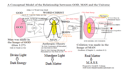 “1 In the beginning was the Word , and the Word was with God (referring to the Only Begotten Son who has within him the quintessence of the Only Begotten Daughter of God), and the Word was God (referring to the Quintessence of Heavenly Father). 2 The same was in the beginning with God (referring to the eternal Father/Son relationship between God and Man).3 All things were made by him ; and without him was not anything made that was made .4 In him was life ( the Tree of life refers to the Sonship of God in contrast to the tree of Knowledge which refers to the Mother/Daughter relationship linked to God’s Love); and the life was the light of men (here we are introduced to the Photon particle of our SMM Gauge Theory as the Light of Man in contrast to the Gluon particle as the Love of Man). 5 And the light shineth in darkness (here the light shining in the darkness refers to dark energy {QCD} manifested as dark matter {QED}); and the darkness comprehended it not (the concept of darkness not comprehending the light of Day refers to the spiritual immaturity of humankind co-existing in the womb spacetime of Heavenly Parent according to the Science of Godism upon the spiritual maturityof Humankind we will be able to comprehend darkness as the holographic images of reality). ” KJV, John 1:1-5