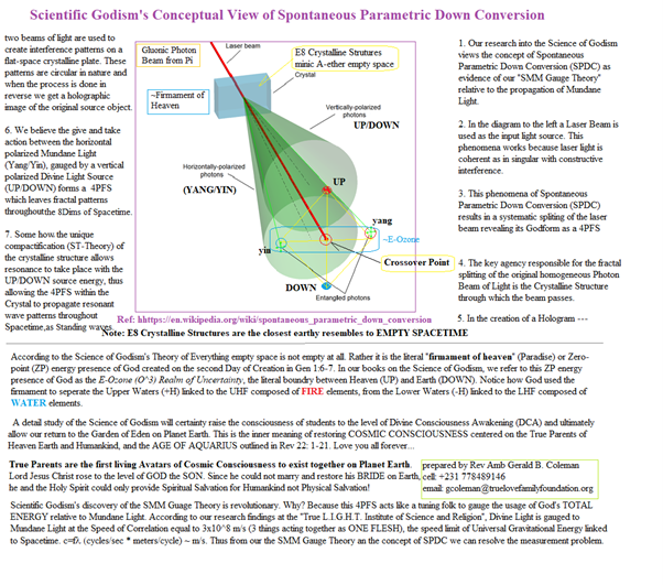 On the foundation of the above background introduction, we need to understand the how and why of Heavenly Parents manifesting their first Divine presence as LIGHT out of DARKNESS. First, let us introduce you to Space and Time as a canvas upon which Heavenly Parents expressed their artistic creativity called the process of Creation. Scientific Godism refers to this creativity as the True Love Way. Motivated by the force of True Love Heavenly Parents developed what we now call the “Li-Group (LI-GHT) Heavenly Technology”[ix] created reality. Science through Maxwell’s equations views LIGHT as Electromagnetic Energy (EM -forces). But what they have not come to understand is that LIGHT also represents the totality of EVERYTHING as ONE THING. It is both a MIND/BODY UNITY construct blended with a Matter/Antimatter or Yang/Yin Unity construct. Nikola Tesla somehow understood this when he said, “Everything is electricity so if you want to find the secrets of the universe think in terms of energy, frequency, and vibrations”. This is the unique discovery of Scientific Godism linked to the 4PFS. It is this ONENESS OF EVERYTHING AS TOTAL ENERGY that allows holographic images to be made from the laser light and E8 Crystals as recorders of Consciousness[x] energy. See Fig 8 for a pictorial of how this process works. It is linked to the holographic Principle and experimentally referred to as the concept of Spontaneous Parametric Down Conversion (SPDC).